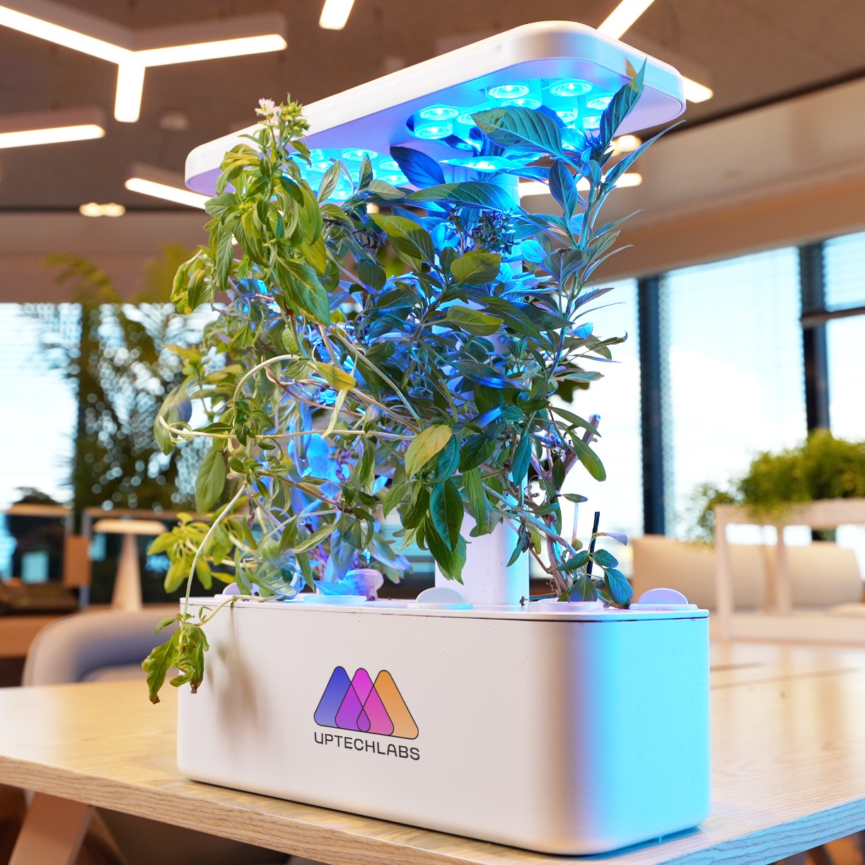 The contrast between the green of the plant and the color of our LED lights, designed to complement the product while supporting healthy plant growth, creating a visually balanced and functional harmony between light, form, and nature.